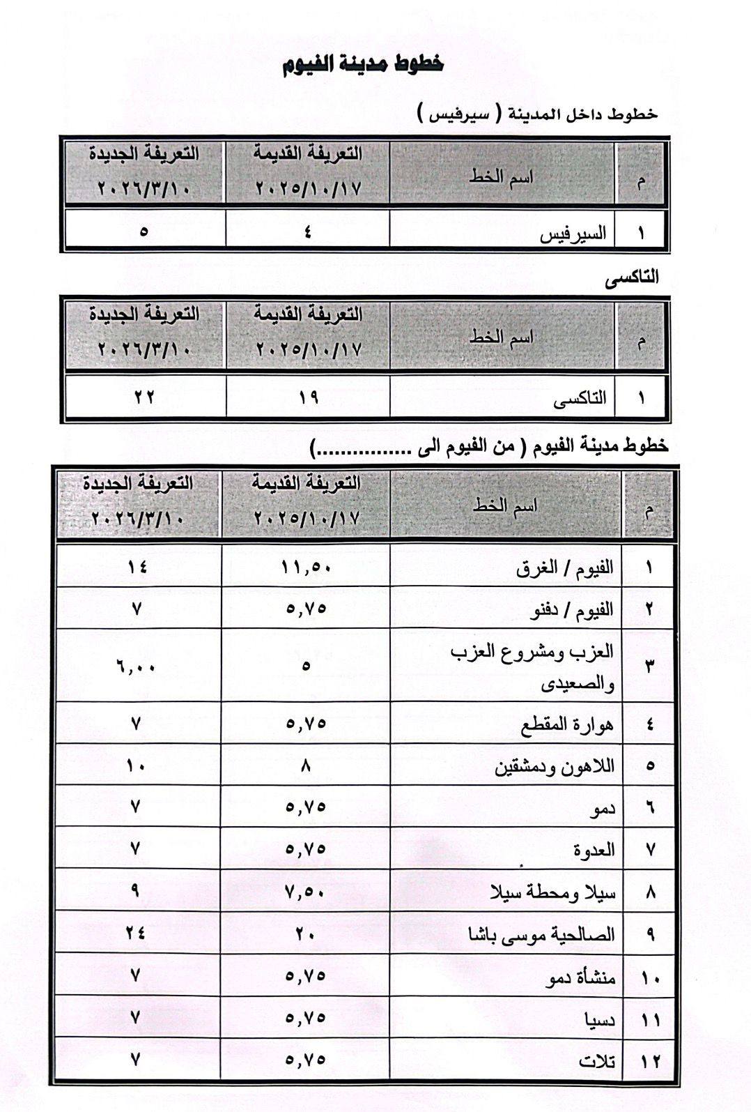 أعلنت محافظة الفيوم تعريفة الركوب الجديدة لخطوط سير السرفيس والتاكسي وسيارات الأجرة العاملة على الخطوط الداخلية والخارجية بين مراكز المحافظة، والمحافظات الأخرى، وذلك بعد إعلان لجنة التسعير التلقائي للمنتجات البترولية، تحريك أسعار البنزين والسولار، بدءاً من صباح اليوم الثلاثاء 10 مارس 2026.